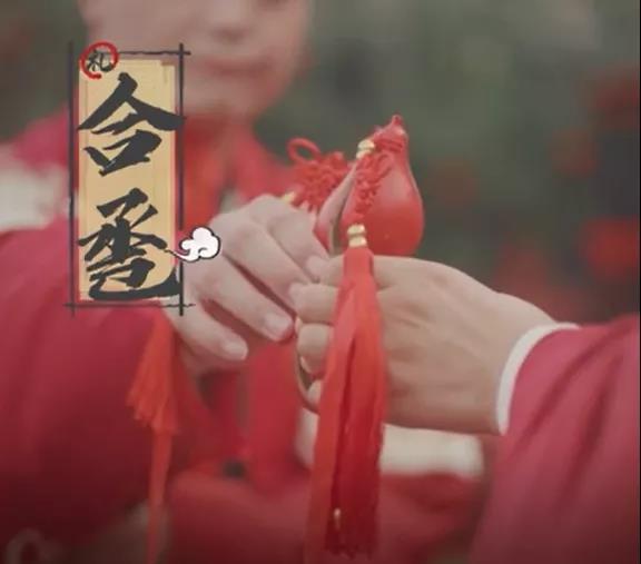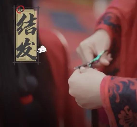 【結(jié)發(fā)jié fà】婚禮最后新郎新娘行解纓結(jié)發(fā)禮,新郎會(huì)在定情之時(shí)贈(zèng)與心上人一縷紅纓,在兩人圣潔的婚禮中由新郎將紅纓解下,再各取自己一縷發(fā)絲,結(jié)在一起,作為愛情永遠(yuǎn)的美好與紀(jì)念。