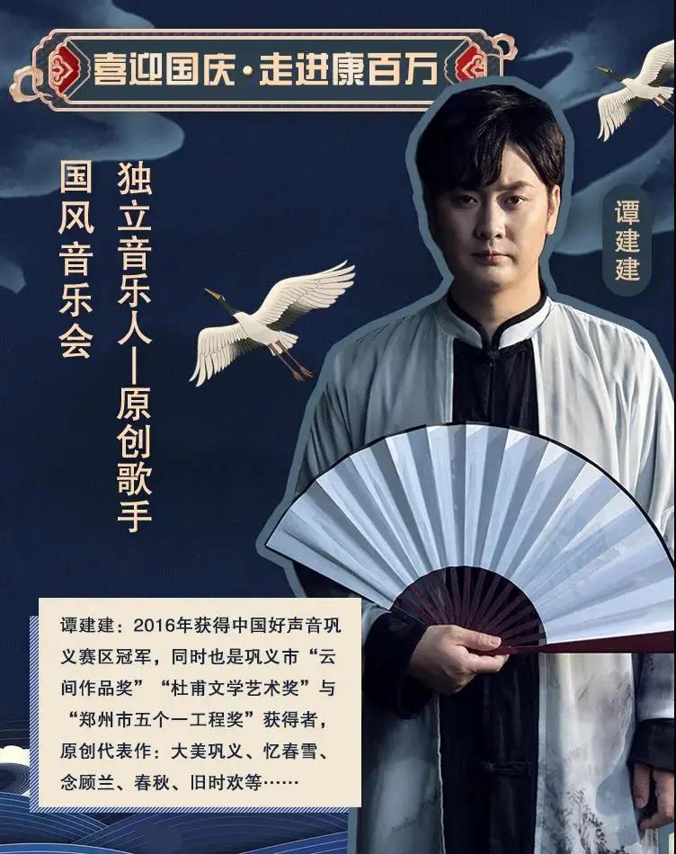 活動(dòng)看點(diǎn):曾獲2016年中國(guó)好聲音鞏義賽區(qū)冠軍的譚建建,在十一期間將攜手漫音樂(lè)樂(lè)隊(duì),帶來(lái)一場(chǎng)國(guó)風(fēng)音樂(lè)會(huì)。
