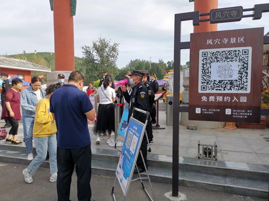 風穴寺景區(qū)嚴格落實“限量、預約、錯峰”相關要求,實行“分時預約瀏覽、錯峰限量入園”,景區(qū)人氣爆棚,游客們正在工作人員地引導下,自覺排隊掃碼、測量體溫,有序進入景區(qū)。
