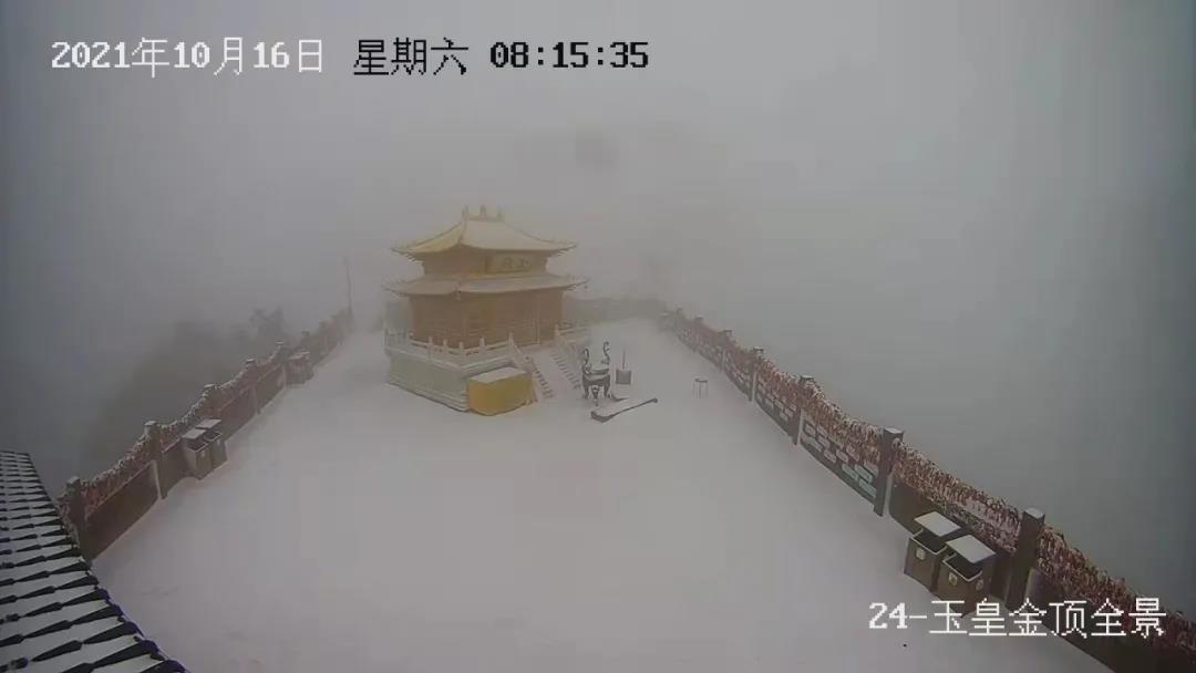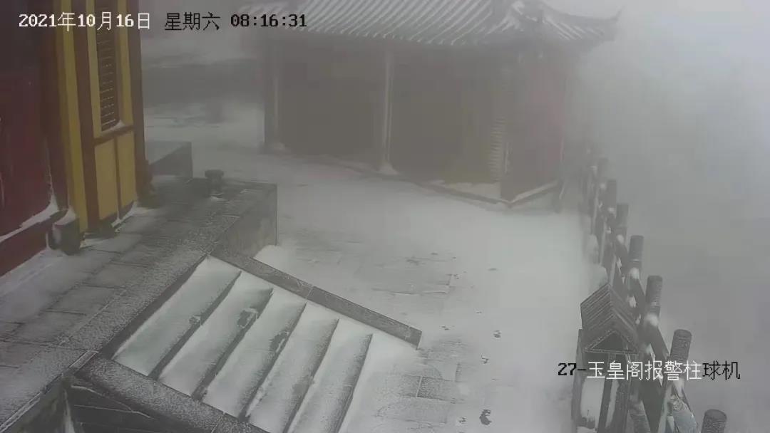 由于云巔氣溫較低,此時(shí)白云山玉皇頂瀏覽區(qū)降雪還在持續(xù),玉皇閣、纜車、草叢中、樹枝間到處都鋪了薄薄的一層白雪,可謂銀裝素裹,為玉皇閣更添了一絲禪意。