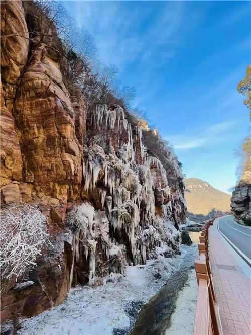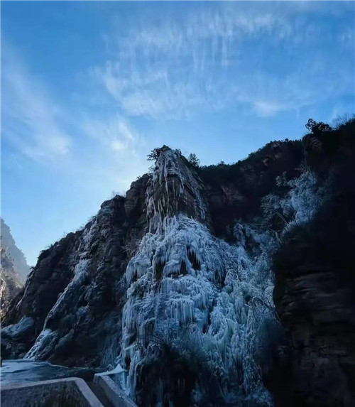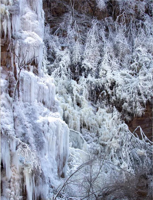 銀妝玉砌的冰瀑,將飛流直下的瀑布變?yōu)槟讨,銀裝素裹、冰峰倒掛,置身其中猶如夢(mèng)幻一般。