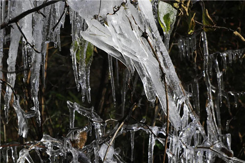 水流從瀑布跌入槽溝,飛濺的浪花和彌天的水霧落在,旁邊的枯葉、樹干、草地上,便結(jié)出了晶瑩剔透的冰條。