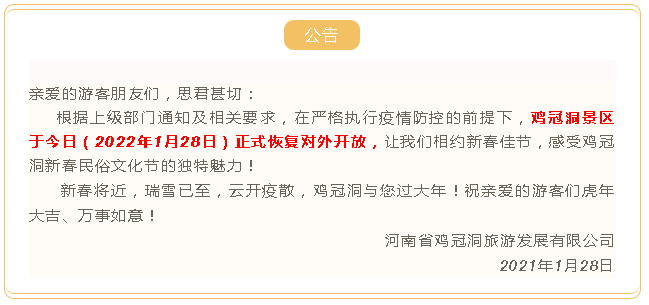 洞內(nèi)億年仙宮恒溫十八度,這里永遠(yuǎn)是春天!洞外銀裝素裹冰雕玉砌,這里賞雪踏雪正當(dāng)時(shí)!新春年味日漸濃,就到“雞冠洞里過大年”!雞冠洞2022新春民俗文化節(jié)已經(jīng)為您準(zhǔn)備好了,只等鑼鼓響起,精彩上演!