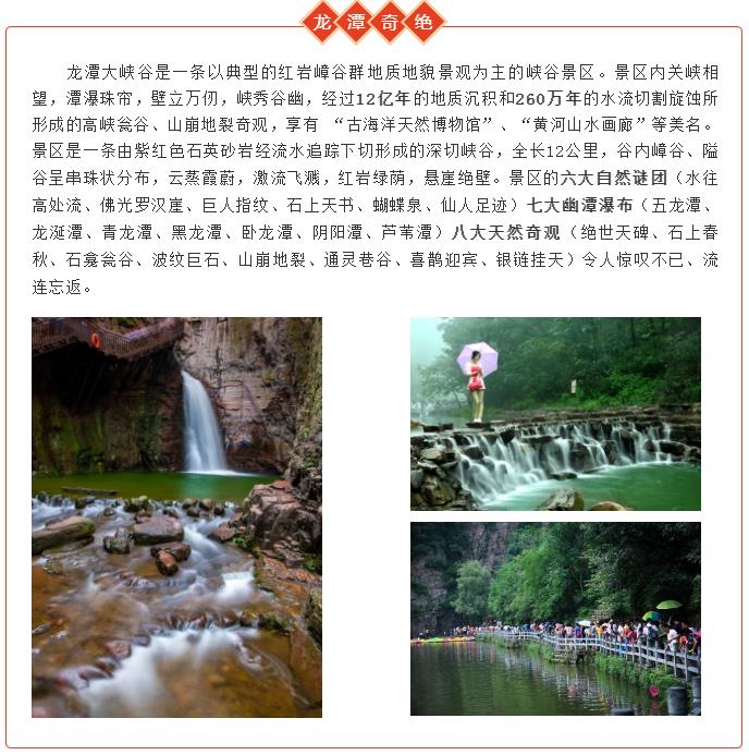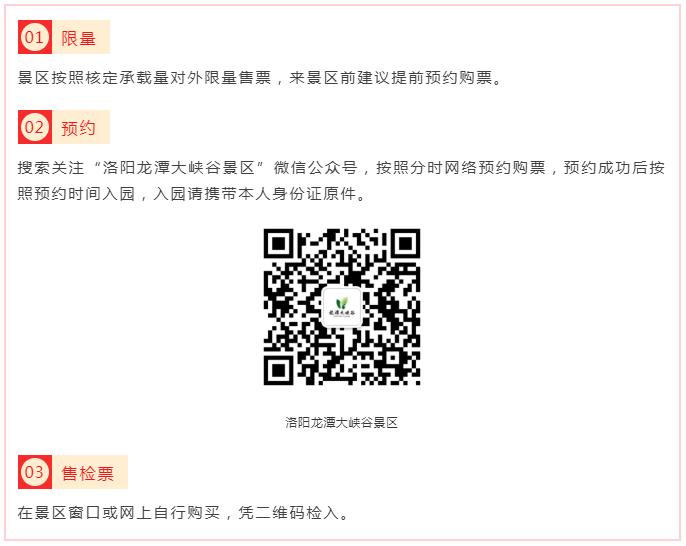 根據(jù)防疫常態(tài)化工作要求,龍?zhí)洞髰{谷景區(qū)將按照“限量、預約、錯峰”的要求,確保景區(qū)開放安全、平穩(wěn)、有序。由于疫情狀況實時變化,購買門票前請?zhí)崆傲私饴尻柺蟹酪哒撸缬幸蓡栒垞艽螂娫?379-69721188具體核實。