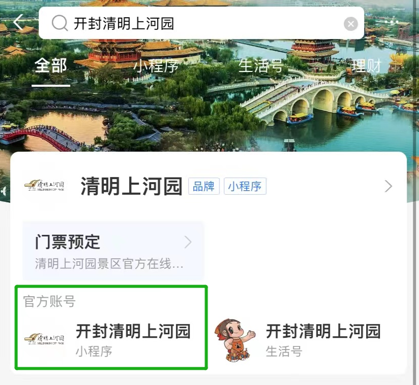 打開支付寶,搜索“開封清明上河園”小程序,點(diǎn)擊“開封清明上河園”小程序,進(jìn)入清明上河園官方商城;