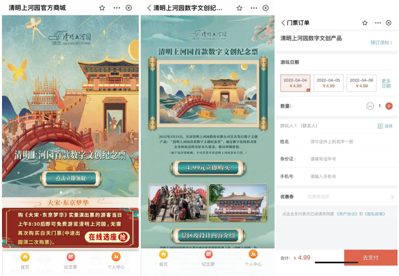 進(jìn)入清明上河園官方商城,點(diǎn)擊清明上河園首款數(shù)字文創(chuàng)紀(jì)念票圖片,進(jìn)入紀(jì)念票詳情,點(diǎn)擊界面中4.99元立即購買,填寫購買人信息后去支付即可。