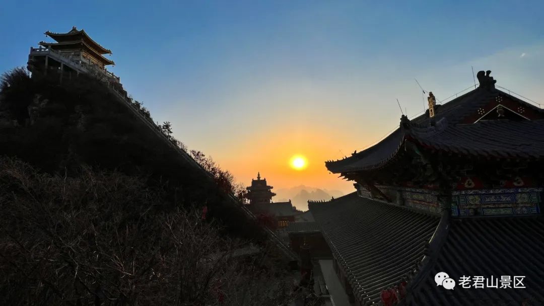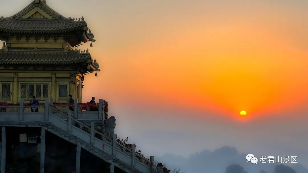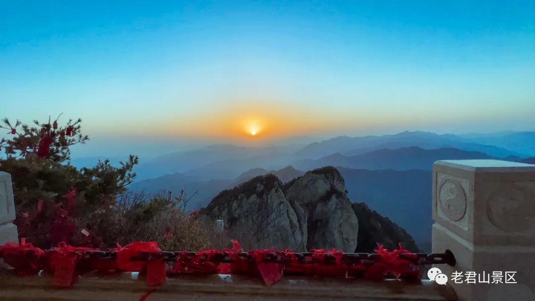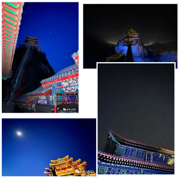 四月的夜晚,風(fēng)還是有些冷的。無人的山頂也只有風(fēng)聲在耳畔響起。如若不是星星透過薄霧一閃一閃,你會誤以為是陰天。夜里的老君山,墨藍(lán)與金色一拍即合,呈現(xiàn)出不一樣的視覺感受。