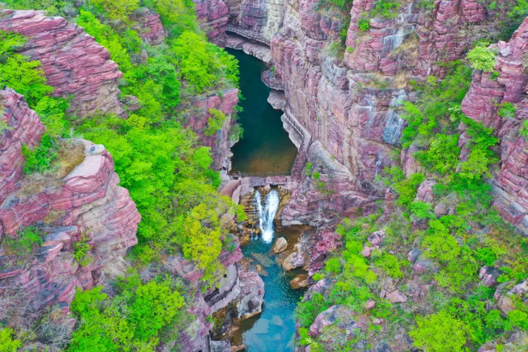 紅石峽丹崖如霞似火,碧潭幽谷在春雨的浸潤下綻放出神秘色彩。