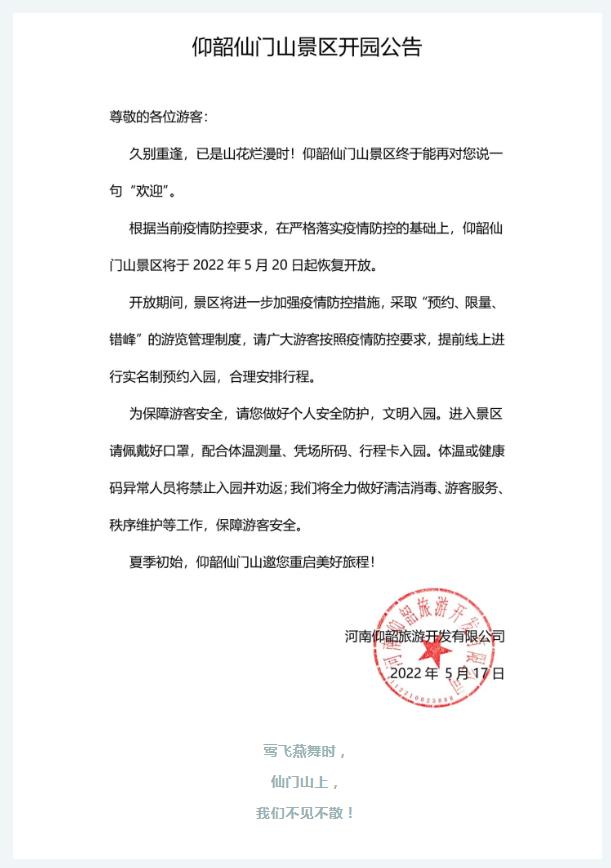 河南仰韶旅游開發(fā)公司5月17日發(fā)布公告,5月20日,仰韶仙門山景區(qū)恢復(fù)開放!