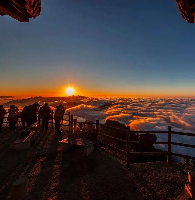 老君山的日出瑰麗榮華,這是晨光與黑夜交替的時刻。你乍看上去,黑色還似乎強大無邊,可是一轉(zhuǎn)眼,清冷的晨曦變?yōu)槌嗉t色的光芒。太陽翻登了云背,臨照在天空……觀日出奇景,體會著李世民那句“拂曉云布色,穿浪日舒光”的旖旎。