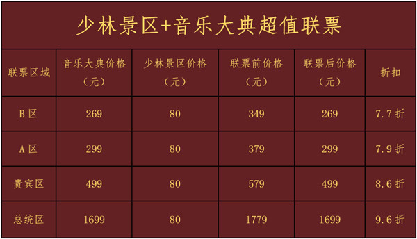 7月1日起,少林景區(qū)與《禪宗少林·音樂大典》強強聯(lián)合,推出“少林景區(qū)+音樂大典超值聯(lián)票”,一張票的價格、兩個王牌項目的超值體驗!