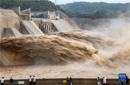 游客觀看黃河小浪底水庫排沙出庫。新華社發(fā)(苗秋鬧攝)