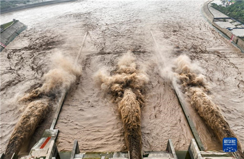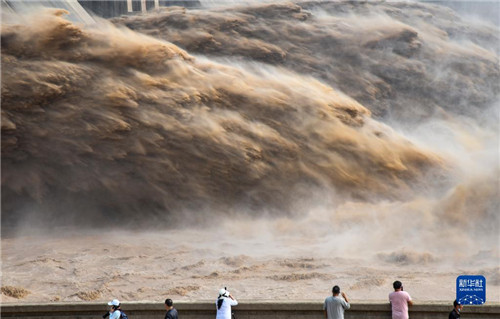 7月4日,黃河小浪底水庫開始排沙,裹挾著泥沙的混濁水流從小浪底出水口排沙洞噴涌而出,場面壯觀。