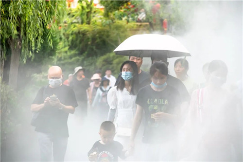 滿園清涼霧森全面開啟,霧氣彌漫,涼意十足!多處喊泉水炮醒目佇立,釋放身心,輕松一夏!