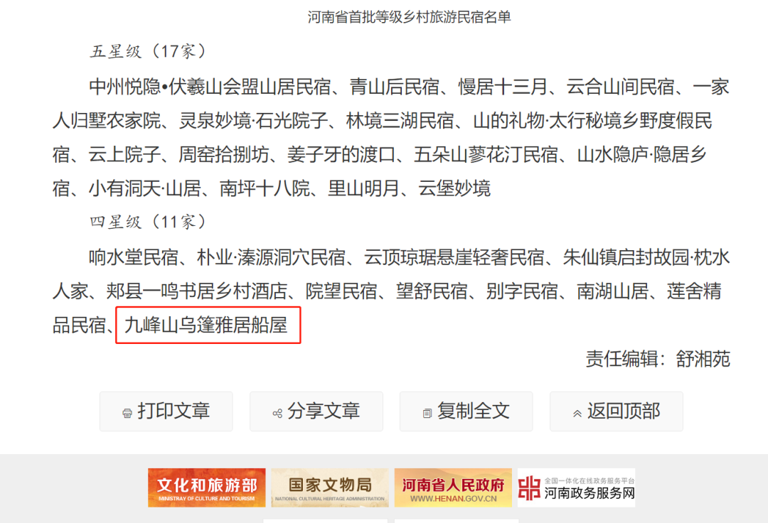 7月7日,河南省文化和旅游廳公布首批鄉(xiāng)村民宿等級(jí)評(píng)定結(jié)果,九峰山景區(qū)船屋被評(píng)為四星級(jí)鄉(xiāng)村旅游民宿。