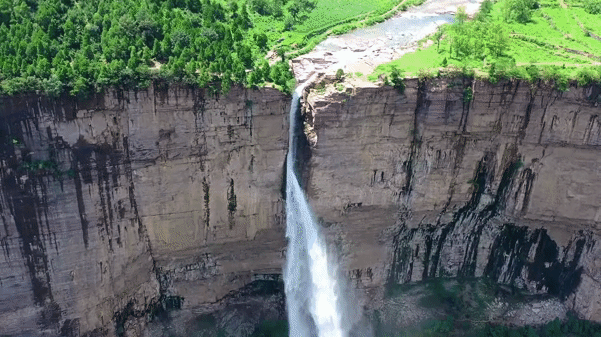 它由距谷底近百米高的懸谷中流出