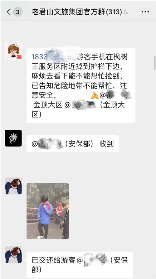 游客手機不慎掉落山下,內(nèi)有重要資料,工作人員收到求助后,立即趕往現(xiàn)場幫其找回,游客深表感謝。