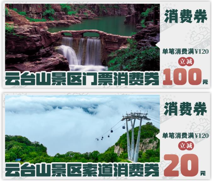 2、索道消費(fèi)券:購(gòu)買(mǎi)云臺(tái)山景區(qū)索道票(往返)單筆消費(fèi)滿(mǎn)120元立減20元;