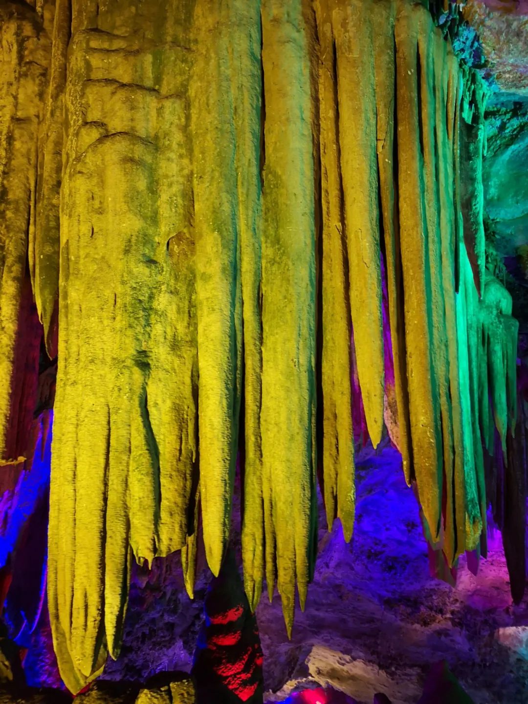 五彩的燈光下,我們穿越億萬年的時(shí)光,與一群仙人相遇。他們神態(tài)各異,或安靜淡然,或至靈至動(dòng),或撩裙踏水,或赤足旋舞,我與他們癡癡相望,一時(shí)間心神恍惚,只想在這幽洞里、清水旁與他們共舞,與他們同唱。不去在乎塵世煩憂,不去理會(huì)世態(tài)炎涼。就這樣,讓最原始、最本真、最簡(jiǎn)單的快樂,把自己的靈魂滋養(yǎng)。這個(gè)地方叫做“眾仙迎客”,雖然只是我們看到的第一個(gè)景觀,卻實(shí)實(shí)在在把我驚到了。