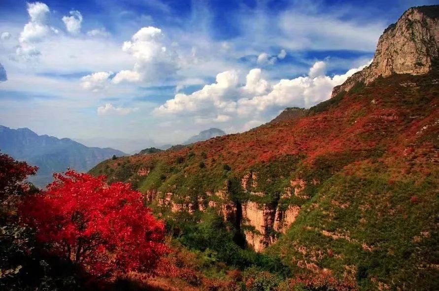 秋天的新鄉(xiāng)南太行紅的令人沉醉,到了秋深愈是紅艷,層層的紅鋪展而來,遠遠看去就像火焰在滾動。