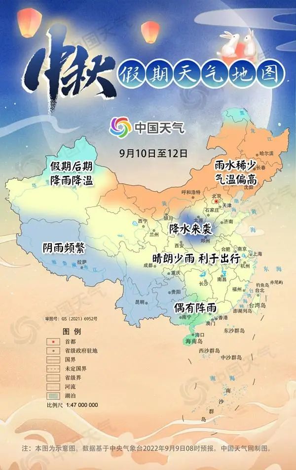 9月10日至12日,華南地區(qū)偶有陣雨,雨水主要出現(xiàn)在廣西中東部、廣東西部等地,且多以小雨為主,但也要防范局地可能出現(xiàn)的短時強降雨等強對流天氣。相比之下,西藏大部、云南、貴州、廣西西部等地的降雨更為持久,中秋假期將一直處在頻繁陰雨中,不僅白天會影響出行,晚上也可能無緣賞月。另外,在陜西北部、山西南部、河南北部等地假期中也會出現(xiàn)一次降水過程,不過假期最后一天上述地區(qū)的雨水就將停止,轉(zhuǎn)為晴朗天氣。