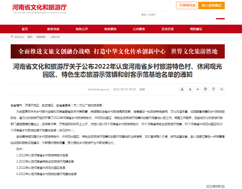 根據(jù)河南省文化和旅游廳官網(wǎng)消息,2022年認(rèn)定河南省鄉(xiāng)村旅游特色村、休閑觀光園區(qū)、特色生態(tài)旅游示范鎮(zhèn)和鄉(xiāng)村旅游創(chuàng)客示范基地名單公布, 我縣多地上榜。