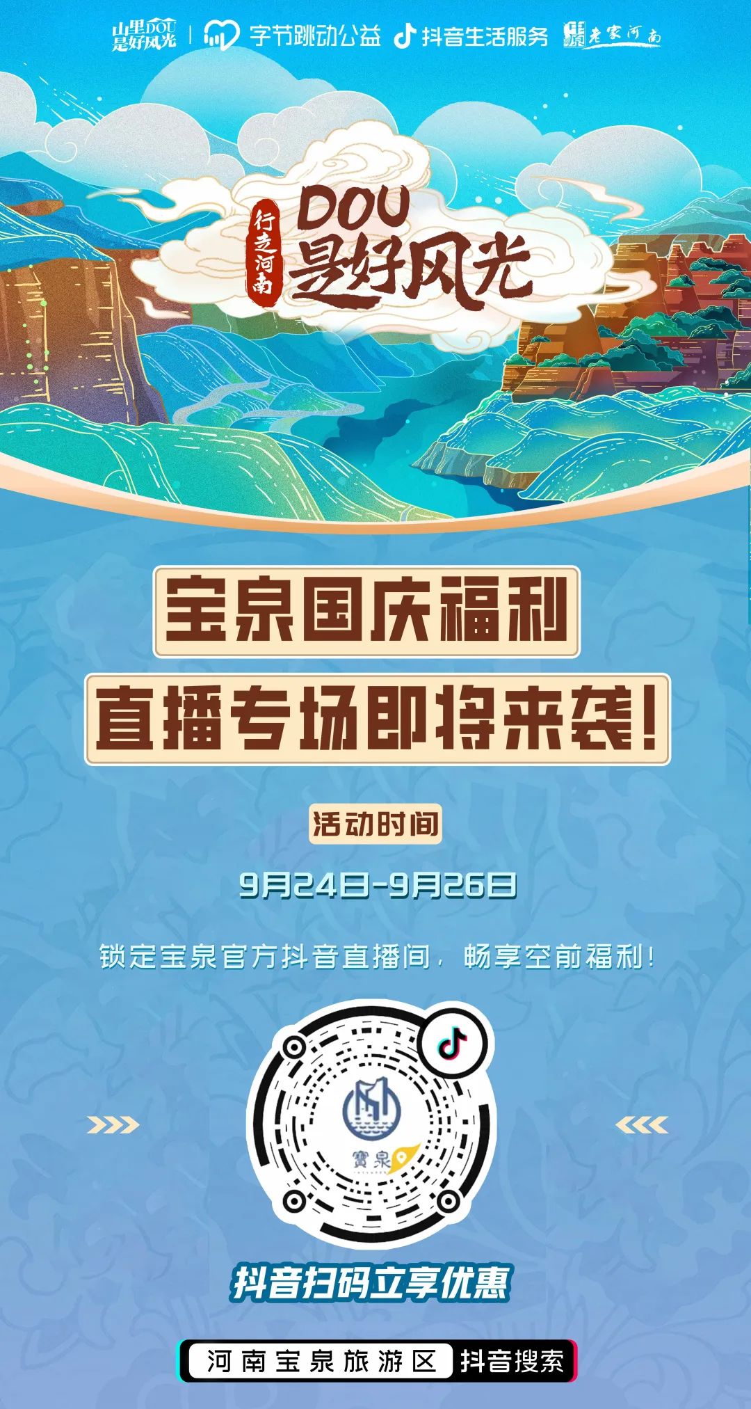 國慶暢玩,福利滿滿。寶泉景區(qū)空前放"價",9月24日-9月26日,寶泉直播專場來襲!官方大力補貼!購票立"減"!河南寶泉旅游區(qū)抖音直播間專享,抖音掃碼即可參與。