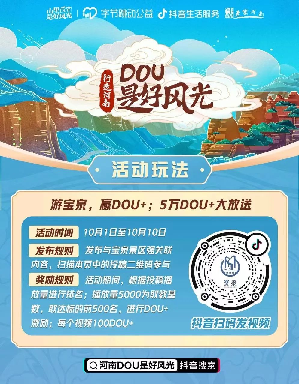 國慶拍抖音,更有機會贏取5萬DOU+,別宅啦,出門即拍視頻上熱門!發(fā)視頻時添加話題:#河南DOU是好風光#,定位:河南寶泉旅游度假區(qū),并@河南寶泉旅游區(qū)官方賬號打開抖音,掃碼參與。