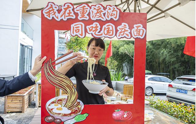 重渡溝景區(qū)對10月1日出生的游客免票入園,所有入園游客送國慶面一份,村里的孩子們擺出中國地圖和中國字樣,用最鮮艷的顏色、最稚嫩的聲音向祖國深情告白。
