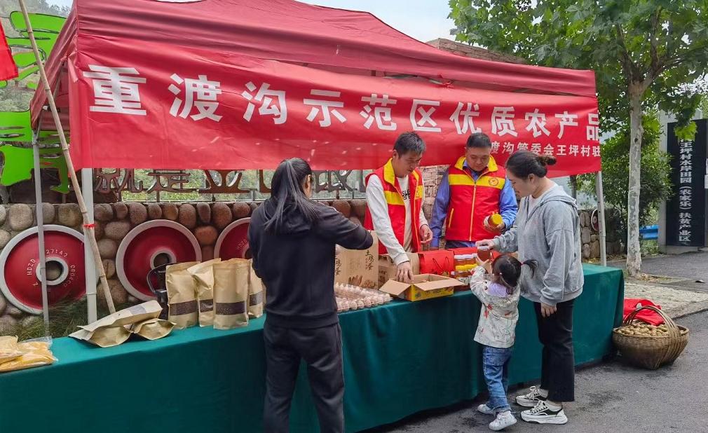重渡溝示范區(qū)聯(lián)合機(jī)關(guān)志愿服務(wù)隊、村干部、駐村工作隊在高速口、鄉(xiāng)村旅游點(diǎn)沿線設(shè)置服務(wù)臺,銷售土雞蛋、花椒、玉米糝、獼猴桃、蜂蜜。