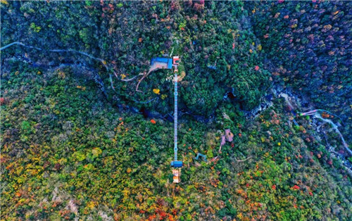 放眼望去,錯落有致的山林與溪流若隱若現(xiàn),與紅葉彩林相映成趣。