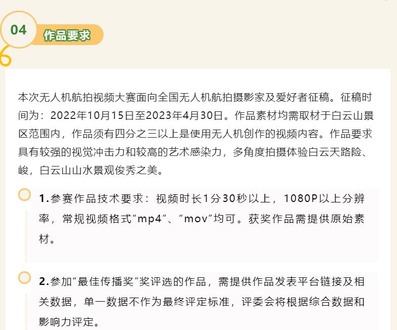 2022洛陽白云山航拍視頻大賽以“解密人間仙境,航拍白云之巔”為主題,全面征集用無人機航拍的主要以反映洛陽白云山景區(qū)內的白云天路以及白云天瀑、白云天湖等山岳景觀、人文風情、景區(qū)標準化建設為主要內容的無人機航拍視頻作品,F(xiàn)將具體情況公告如下: