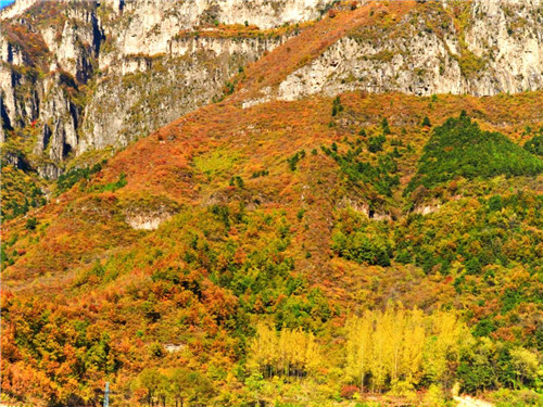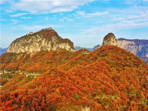 十一月的新鄉(xiāng)南太行,如同一座座火焰山,本就赭紅的山體,因?yàn)橛辛藵M山隨風(fēng)招展的紅葉,顯得更加生動(dòng)而美妙。