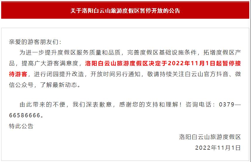 洛陽(yáng)白云山旅游度假區(qū)11月1日發(fā)布公告,為進(jìn)一步提升度假區(qū)服務(wù)質(zhì)量和品質(zhì),完善度假區(qū)基礎(chǔ)設(shè)施條件,拓增度假區(qū)產(chǎn)品,提高廣大游客滿意度,洛陽(yáng)白云山旅游度假區(qū)決定于2022年11月1日起暫停接待游客,進(jìn)行閉園提升改造,開(kāi)放時(shí)間另行通知,敬請(qǐng)持續(xù)關(guān)注白云山官方抖音、微信公眾號(hào),了解最新動(dòng)態(tài)。