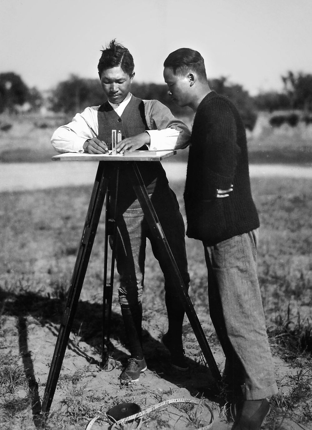 董作賓(右)和李春昱在殷墟第一次發(fā)掘中測量繪圖(資料照片)。新華社發(fā)