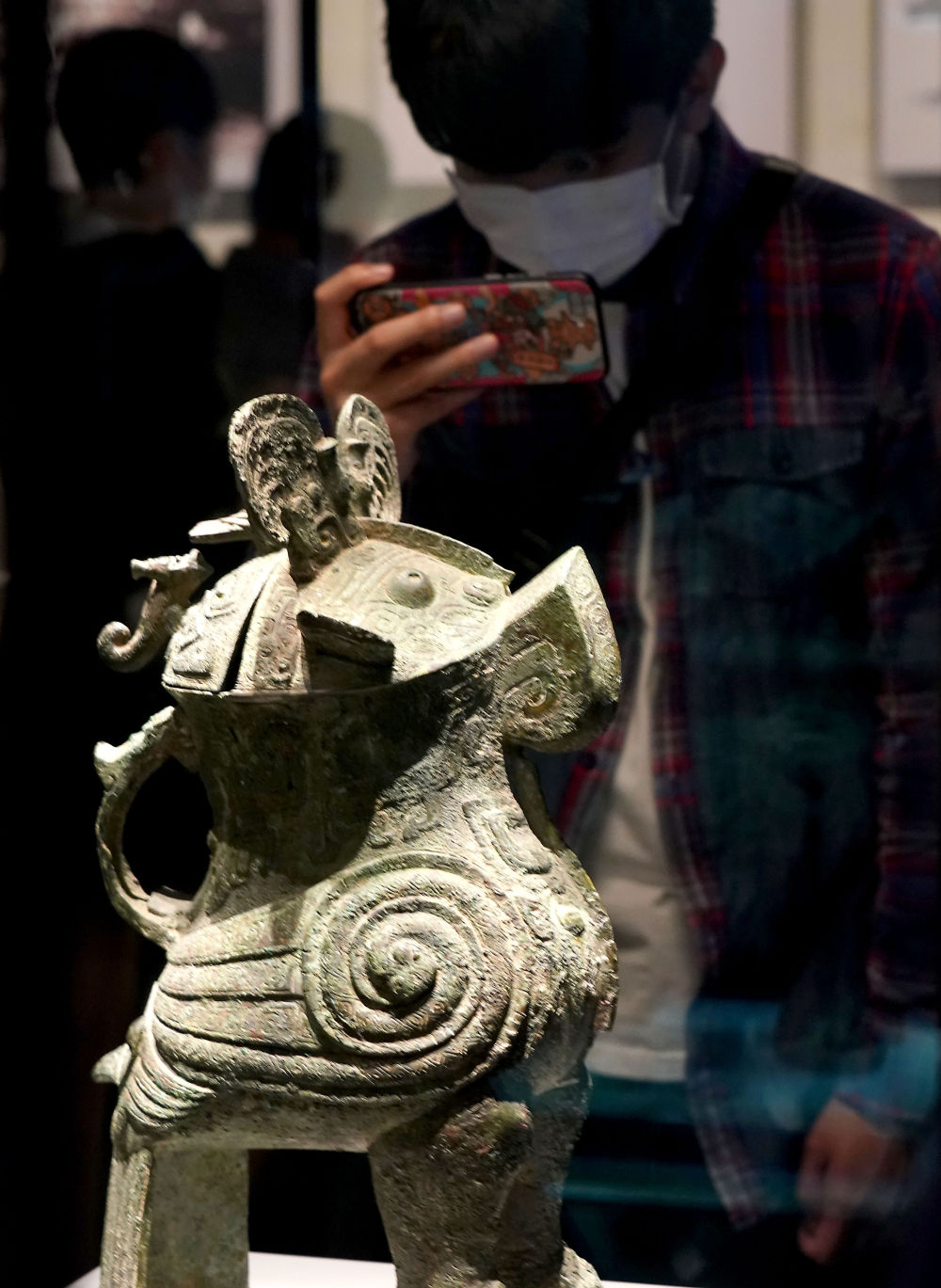 參觀者在河南博物院主展館內(nèi)拍攝展品婦好鸮尊(2020年9月24日攝)。新華社記者 李安 攝