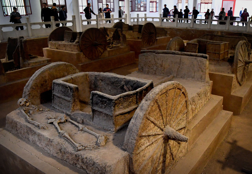 游客在河南安陽殷墟宮殿宗廟遺址內(nèi)的車馬坑參觀(2018年10月14日攝)。新華社記者 李安 攝