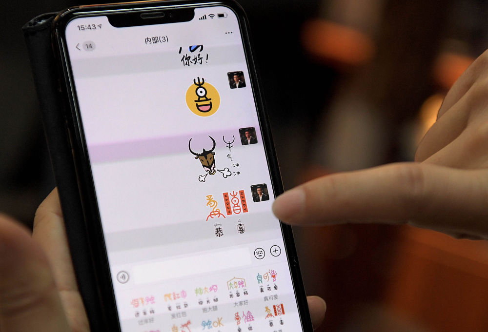 清華大學(xué)美術(shù)學(xué)院教授陳楠在位于清華大學(xué)的工作室內(nèi)展示他設(shè)計發(fā)布的甲骨文表情包(2019年9月24日攝)。新華社記者 李安 攝