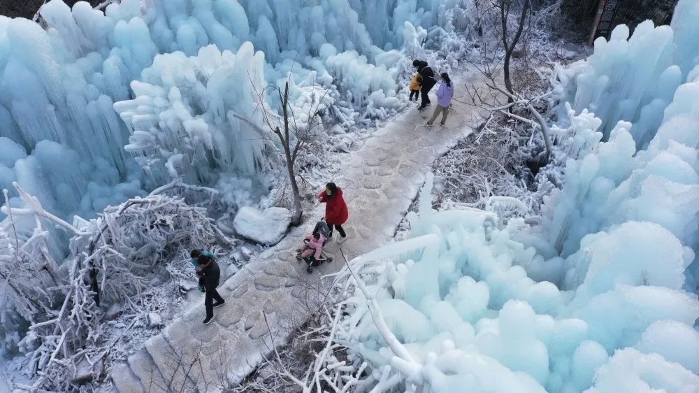 此時的新鄉(xiāng)南太行被冰雪覆蓋,時而有晶瑩剔透的冰掛圍繞,時而有驚艷朋友圈的霧凇美景。