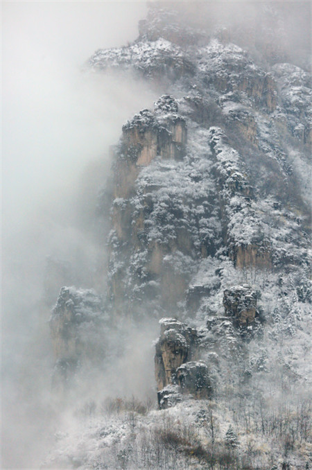 松樹(shù)換上雪裳,葉子藏在若隱若現(xiàn)的雪花下,大自然的鬼斧神工,把這個(gè)時(shí)節(jié)的太行大峽谷裝扮的無(wú)比奇幻。