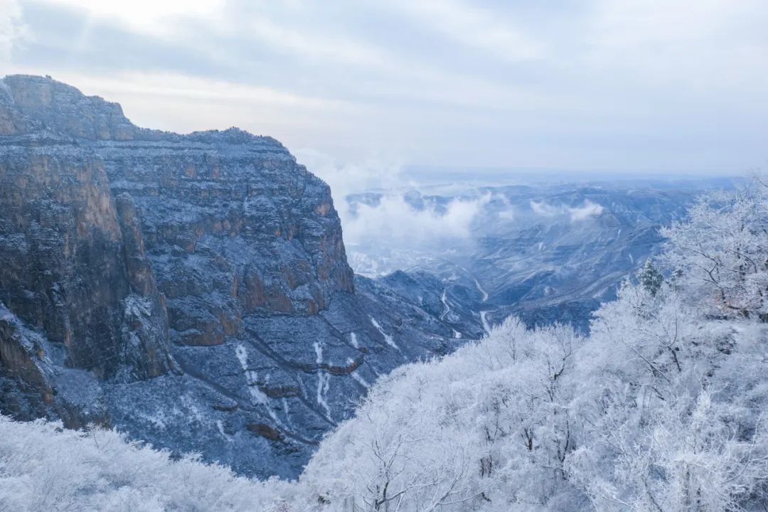 變了!變了!云臺山變色了!雪山!云海!霧!疊嶂山巒、樹木枝頭都被披上白色盛裝!漫山遍野玉樹瓊枝!銀裝素裹!在蒸騰的霧色里猶如一幅山水畫!這不是一般的山!這是王維詩里的云臺山!