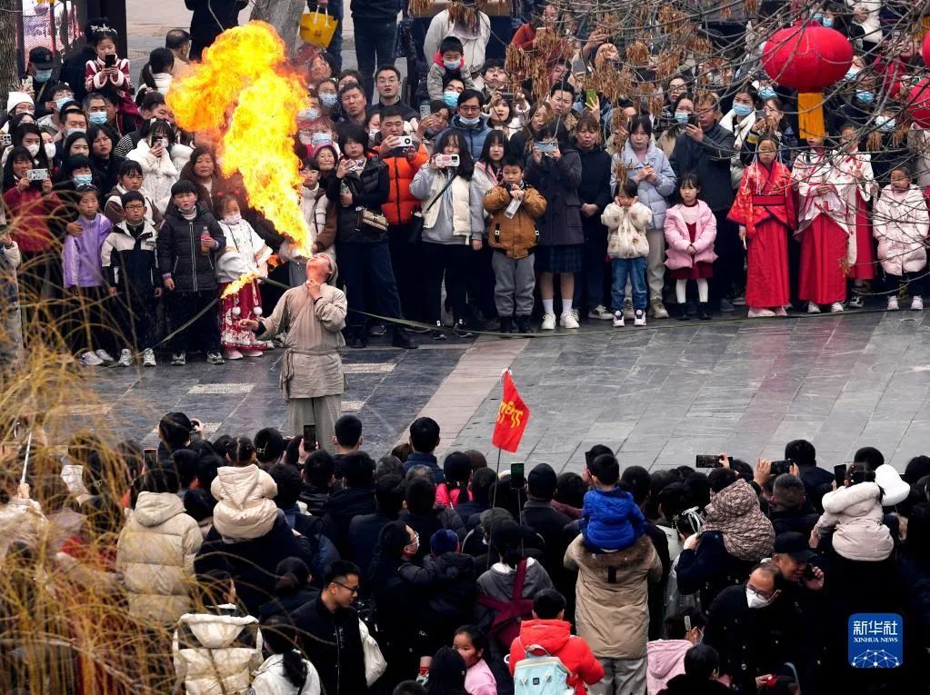 2月18日,游客在開封清明上河園景區(qū)內(nèi)觀看民俗表演。