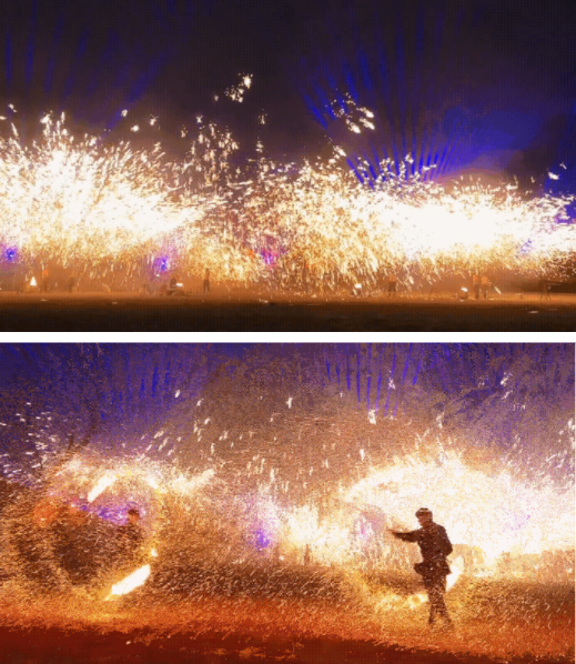 伴隨“叮叮當(dāng)當(dāng)”的敲擊聲,看鐵水在空中綻放成花,一團(tuán)團(tuán)、一簇簇,爭相怒放,唯美、壯觀。