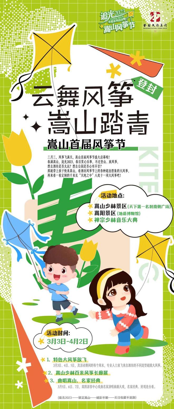 2023年3月3日-4月2日,在少林景區(qū)和嵩陽景區(qū)舉行的嵩山首屆風(fēng)箏節(jié)即將盛大開幕!春日賞心樂事,一年當(dāng)中最適合放風(fēng)箏的季節(jié)即將到來!那就帶上孩子快來嵩山,看濰坊風(fēng)箏節(jié)上的各種超出想象的大風(fēng)箏,再來看一看定制的千米長“天地之中”八處十一項(xiàng)大風(fēng)箏吧!
