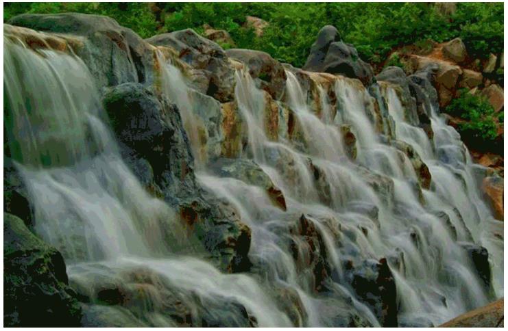 順著下山路移步南山門(mén)暴瀑峽,跟隨路牌指引一路來(lái)到奇絕幽秘暴瀑峽。潺潺流水自上而下自由流淌,嘩嘩之聲清脆悅耳。清澈見(jiàn)底的溪水里到處可見(jiàn)悠然自得的小魚(yú),在山巒峽谷間看積水成湖,宛若一塊碧玉鑲嵌于山中,與崇山峻嶺相映成趣。