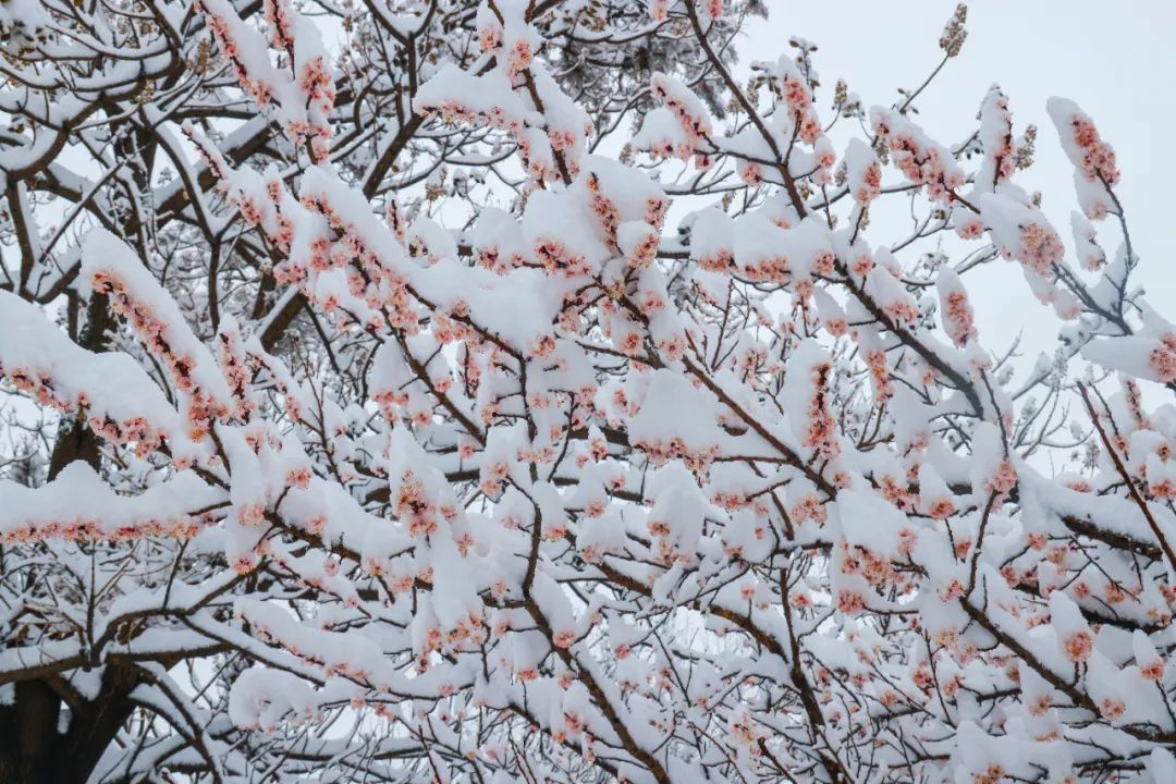 春花遇春雪 ,怒放的桃花、杏花、連翹等山花 ,在白雪的裝扮下 ,嬌艷欲滴,別有一番風韻。
