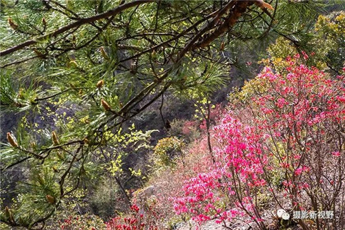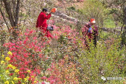 映山紅怒放枝頭,賞花游客醉在花海中。