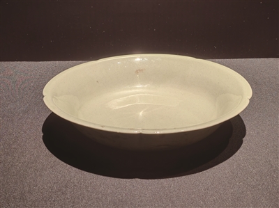遠遠看去,它如冰似玉,碟中似有一汪清澈的泉水,在燈光照射下閃閃發(fā)亮。走近看,它釉層輕薄瑩潤、胎質細膩純凈,顏色似黃非黃,灰綠中透出天青色,發(fā)出淡雅柔和的光澤。