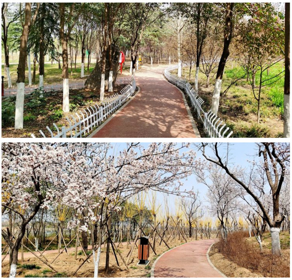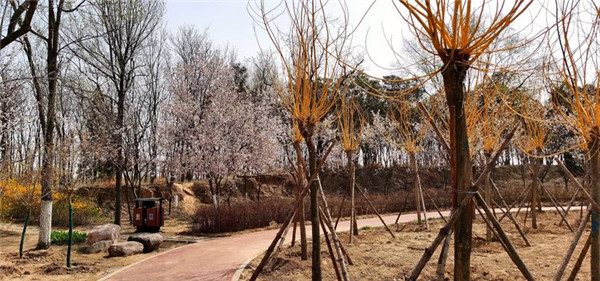 健康步道兩旁迎春花、櫻花競相開放,猶如一道靚麗的風景線,漫步在步道上,欣賞著美麗的風景,心情十分愜意。