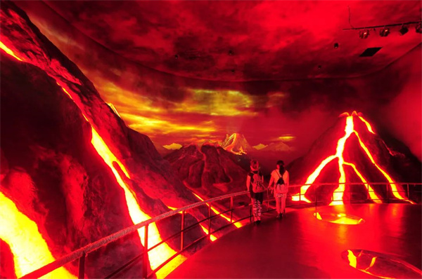 游客進(jìn)入體驗(yàn)空間,結(jié)合動(dòng)感平臺(tái),體驗(yàn)3分鐘火山爆發(fā)特效。項(xiàng)目采用多通道高清融合投影+實(shí)景立體造型+異形融合遮罩的展示方式,實(shí)現(xiàn)了實(shí)景融合投影+震動(dòng)平臺(tái)同步+物理特效同步+環(huán)繞音響同步的交互效果。